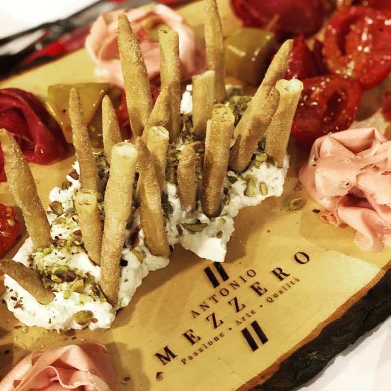 An antipasto by Antonio's pen, ricotta with pistachios and artisanal grissinos, with Bolognese mortadella and fresh semi-dry tomato.