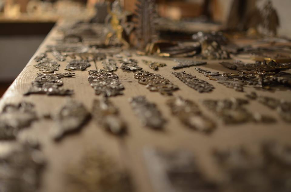 The Casa Achilles seems always like a little lovely drawing room, finely decorated, where the metallic fittings showcases look like pretty classic paintings. The furniture, historical and chosen on purpose, works wonderfully with the chandeliers and wall lamps that seem to have just arrived from Versailles, or from the Schönbrunn. In a small side door, the scenery changes diametrically, but remains fascinating: it is the workshops, with more than 100 years of built in work, and remembers something that seems coming out from Lord of the Rings, or from Faust studio, in good opera scenery light, under industry colours and still showing, proudly, the original floor ovens.